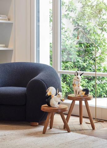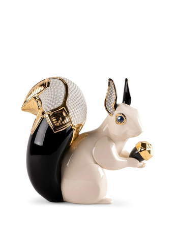 Esta ardilla pertenece a una colección que nace de la idea de interpretar en porcelana la joyería que tantas veces protagonizan y como la joya que son en sí mismos. Su planteamiento formal y estético busca reflejar ese tratamiento joya a través de dos elementos clave. Por un lado, la escultura inspirada en la líneas depuradas y geométricas del art decó, también presente en los grabados en espiga de su cola. Y por otro, con la decoración elegida como el negro abisal, el gris perlado con el que se pintan las innumerables “perlitas” que la adornan o los ojos azul zafiro, enmarcados en lustre dorado. Una creación con espíritu de joya elaborada a mano en porcelana.