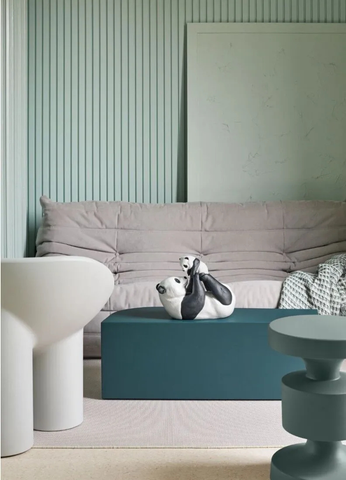 Escultura de porcelana que muestra una tierna escena protagonizada por una mamá panda y su cría.