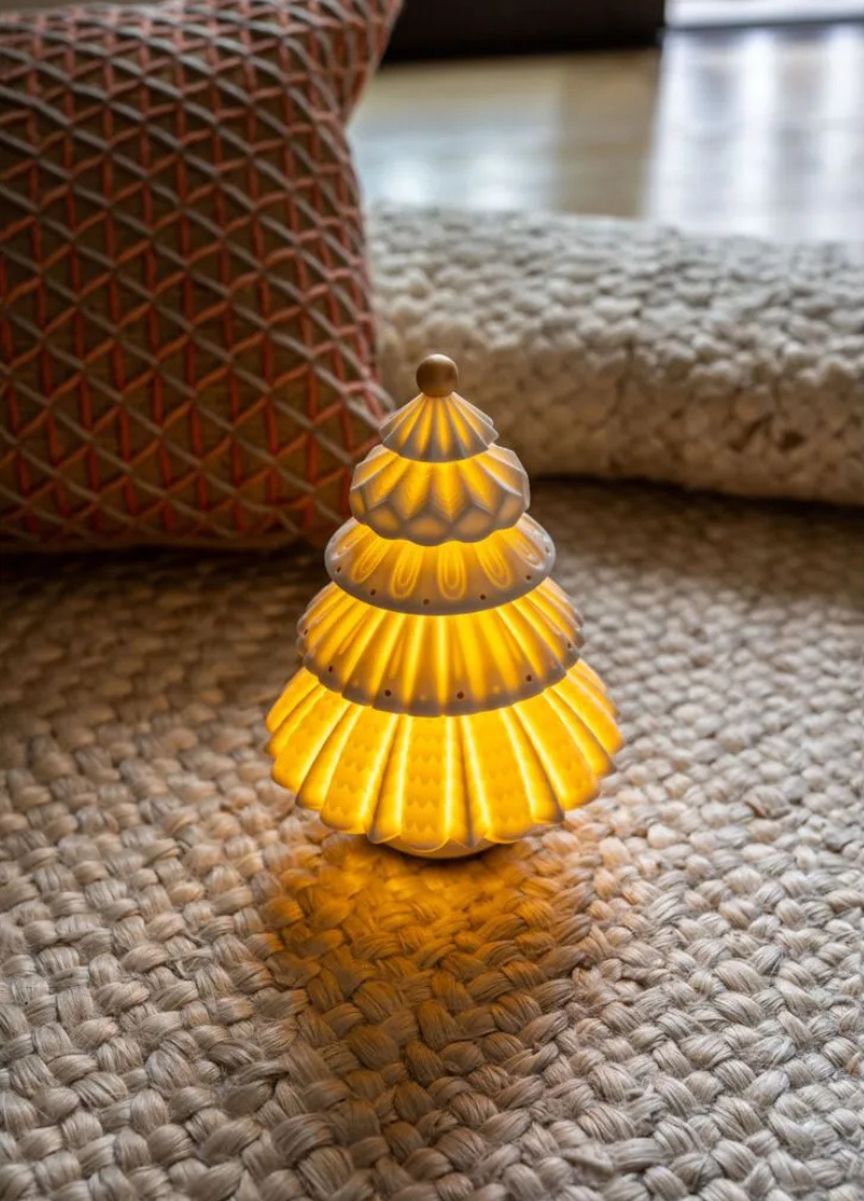 Esta lámpara inalámbrica está inspirada en el abeto, uno de los símbolos más universales de las celebraciones del invierno Está elaborada en porcelana mate decorada con delicados grabados y detalles de lustre dorado. Cuando la luz se enciende, todos los grabados se destacan bañados por la cálida luz que se filtra a través de la porcelana. Lámpara inalámbrica LED